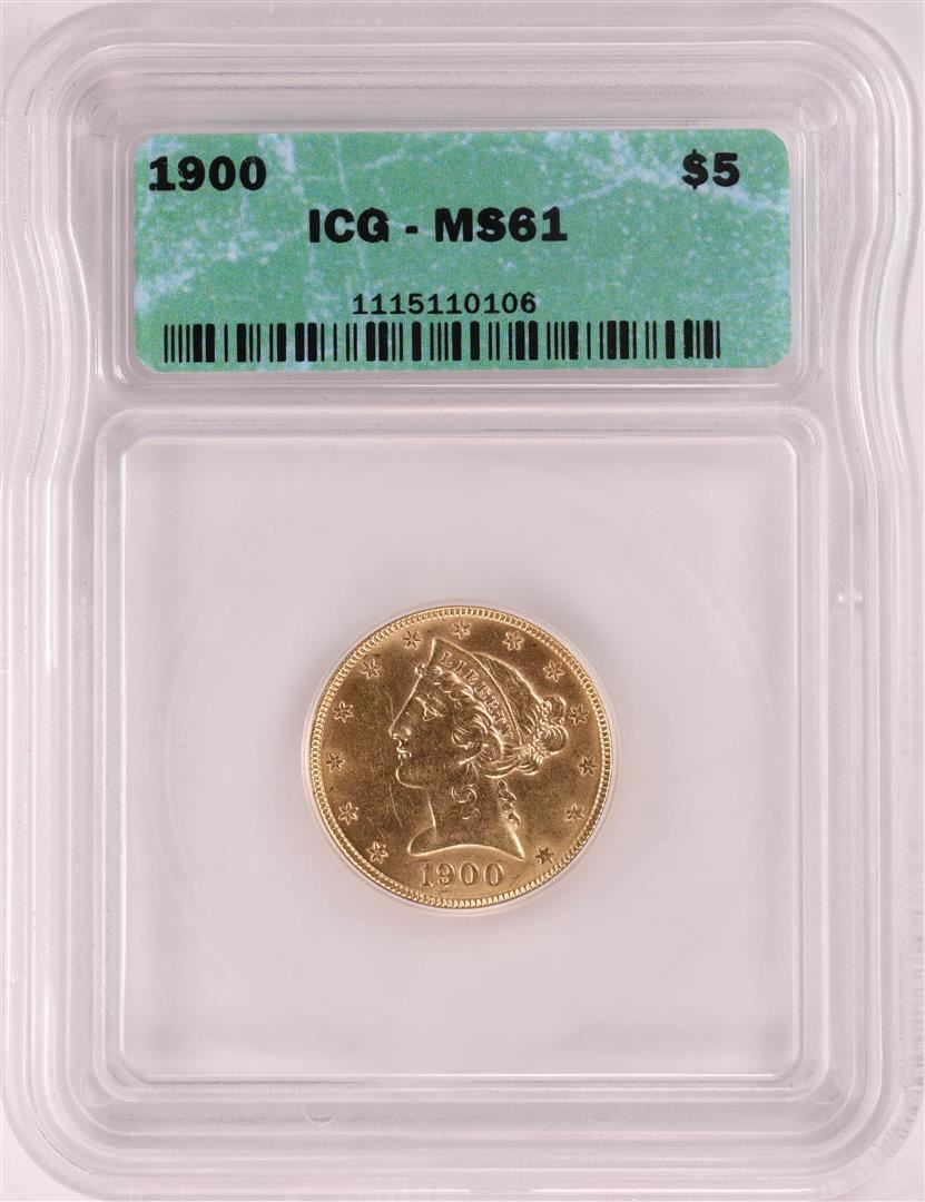One 1900 $5 Liberty Head Half Eagle Gold Coin ICG MS61. ICG Certified.