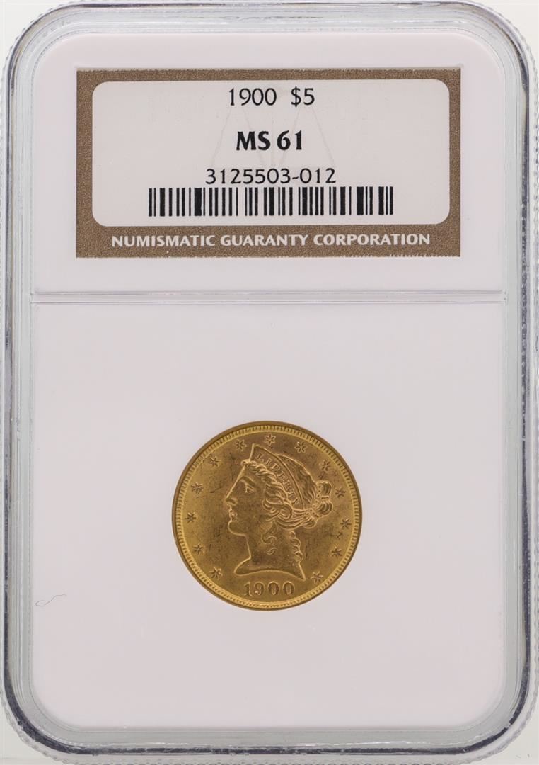 One 1900 $5 Liberty Head Half Eagle Gold Coin NGC MS61. NGC Certified.