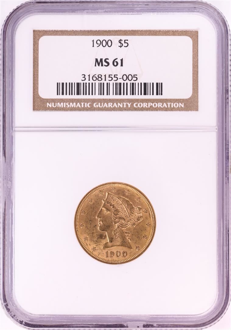 One 1900 $5 Liberty Head Half Eagle Gold Coin NGC MS61. NGC Certified.