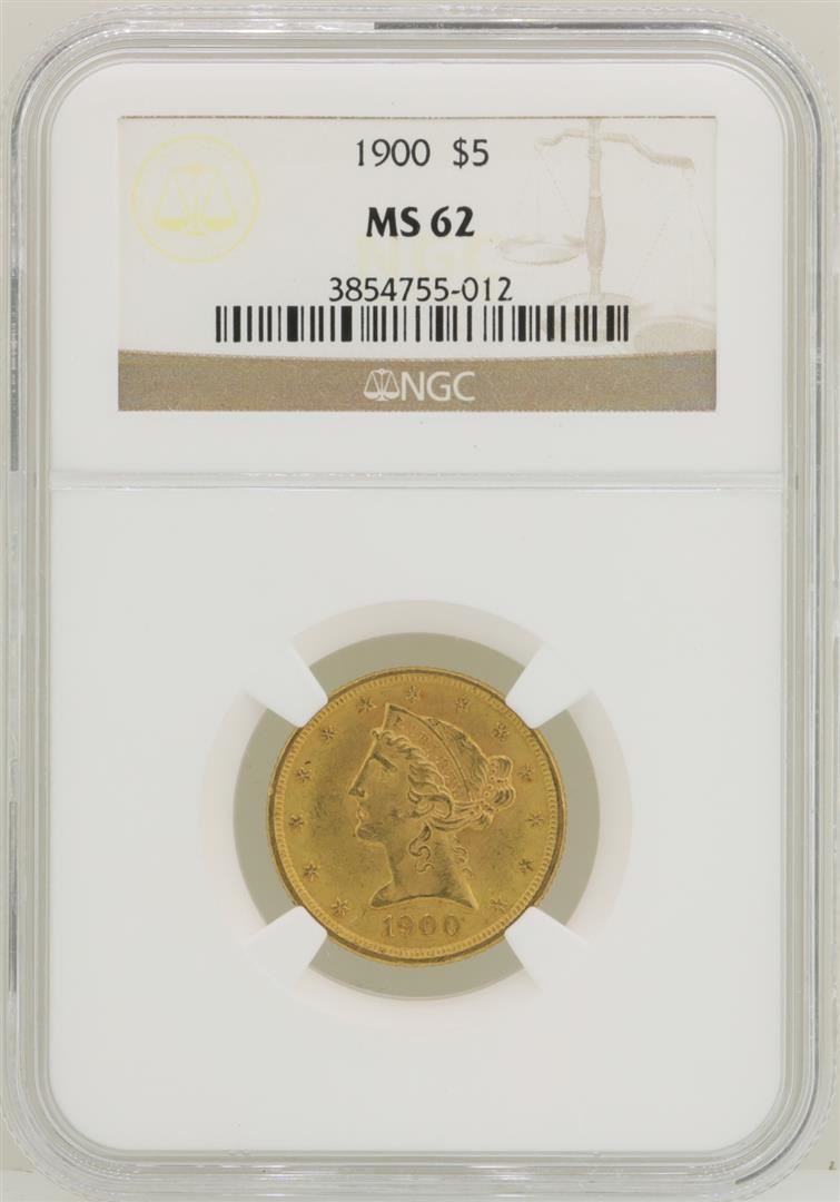 One 1900 $5 Liberty Head Half Eagle Gold Coin NGC MS62. NGC Certified.