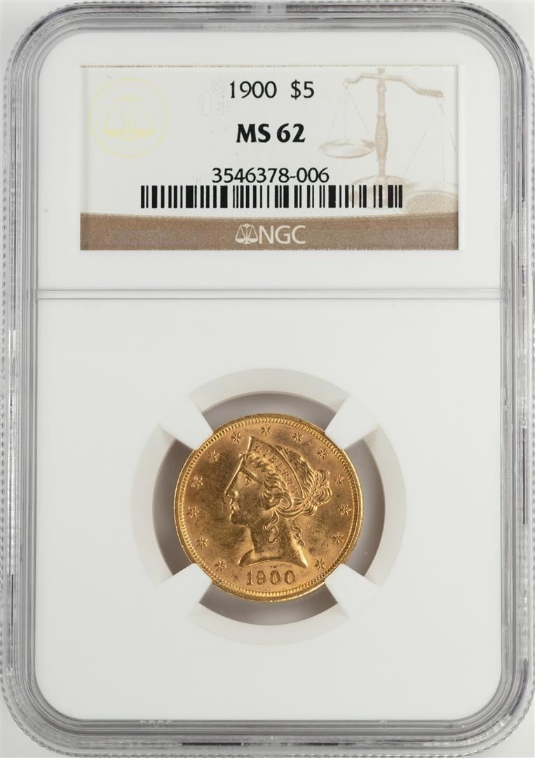 One 1900 $5 Liberty Head Half Eagle Gold Coin NGC MS62. NGC Certified.