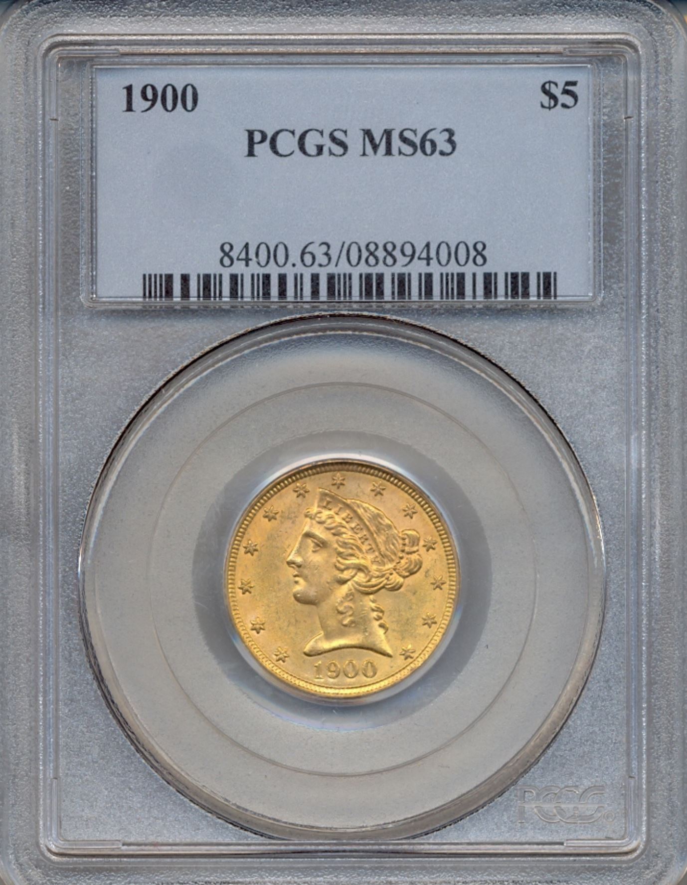 One 1900 $5 Liberty Head Half Eagle Gold Coin PCGS MS63.