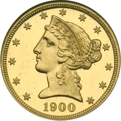 1900 $5 Liberty. NGC graded Proof 64 Ultra Cameo. 230 pieces minted. The Philadelphia Mint struck a fair number of Proofs in 1900 compared to earlier years, but the survival rate seems to be low in proportion to some other dates. Few are certified this choice, few respectable middle-grade specimens find their way into the market. The fields are deep, swirling pools of reflectivity, contrasted by devices on each side that show the deep satiny effect from frost on the dies. An excellent opportunity to acquire the a choice 1900 turn-of-the-century Proof half eagle without having to pay two or three times the price for a Proof 65 or 66 of this desirable date. Pop 5; 18 finer; 9 in 65; 4 in 66; 3 in 67; 1 in 68; 1 in 69 Star.