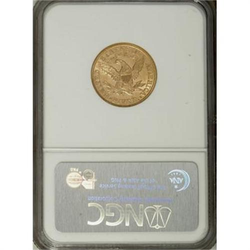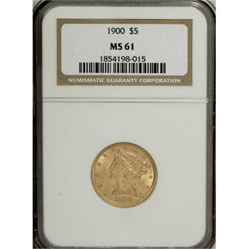 <B>1900 $5 MS61 NGC.</B></I> NGC Census: (1931/7543). PCGS Population (910/4545). Mintage: 1,405,730. Numismedia Wsl. Price for NGC/PCGS coin in MS61: $250. (#8400)<BR><BR><B>Coin Engraver:</B> Christian Gobrecht<BR><BR><b>Shipping:</b> Coins & Currency (<a target="_blank" href="http://www.heritageauctions.com/common/shipping.php">view shipping information</a>\)