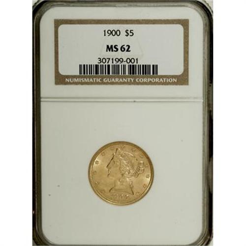 <B>1900 $5 MS62 NGC.</B></I> NGC Census: (3842/3639). PCGS Population (2317/2228). Mintage: 1,405,730. Numismedia Wsl. Price for NGC/PCGS coin in MS62: $265. (#8400)<BR><BR><b>Shipping:</b> Coins & Currency (<a target="_blank" href="http://www.heritageauctions.com/common/shipping.php">view shipping information</a>)