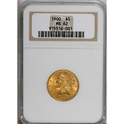 <B>1900 $5 MS62 NGC.</B></I> NGC Census: (3891/3715). PCGS Population (2336/2288). Mintage: 1,405,730. Numismedia Wsl. Price for NGC/PCGS coin in MS62: $310. (#8400)<BR><BR><B>Coin Engraver:</B> Christian Gobrecht<BR><BR><b>Shipping:</b> Coins & Currency (<a target="_blank" href="http://www.heritageauctions.com/common/shipping.php">view shipping information</a>)