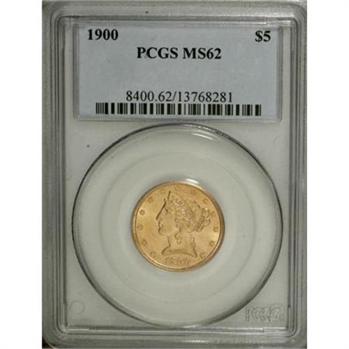 <B>1900 $5 MS62 PCGS.</B></I> PCGS Population (2410/2378). NGC Census: (4063/3867). Mintage: 1,405,730. Numismedia Wsl. Price for NGC/PCGS coin in MS62: $330. (#8400)<BR><BR><B>Coin Engraver:</B> Christian Gobrecht<BR><BR><b>Shipping:</b> Coins & Currency (<a target="_blank" href="http://www.heritageauctions.com/common/shipping.php">view shipping information</a>)