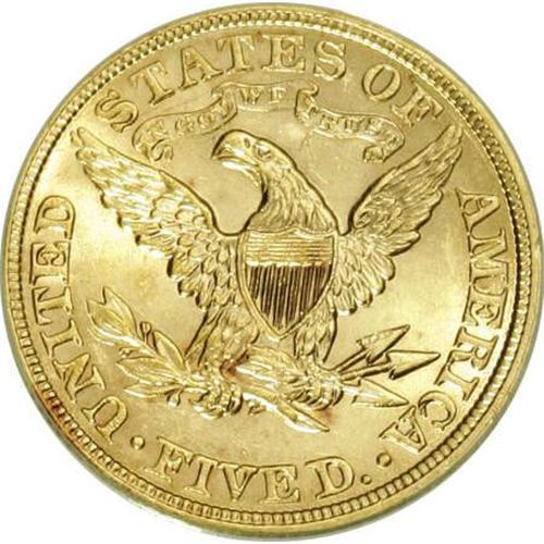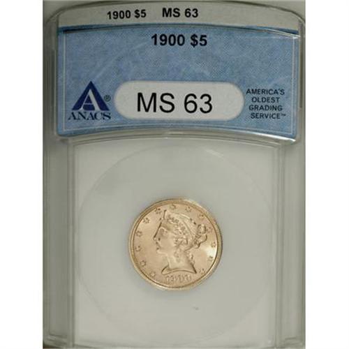 <B>1900 $5 MS63 ANACS.</B></I> NGC Census: (2425/1456). PCGS Population (1714/657). Mintage: 1,405,730. Numismedia Wsl. Price for NGC/PCGS coin in MS63: $950. (#8400)<BR><BR><B>Coin Engraver:</B> Christian Gobrecht<BR><BR><b>Shipping:</b> Coins & Currency (<a target="_blank" href="http://www.heritageauctions.com/common/shipping.php">view shipping information</a>)