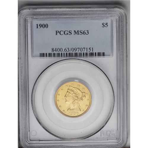 1900 $5 MS63 PCGS. Boldly struck, bright, and satiny, 1900[$5] MS63 PCGS.
