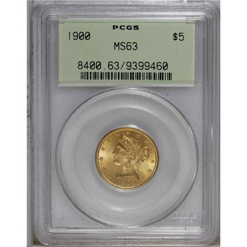 <B>1900<$5> MS63 PCGS.</B></I> This charming example has the look of a higher grade when viewed with the unaided eye. Examination beneath a glass locates infrequent minor marks. Housed in an old green label holder.