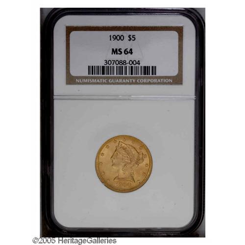 <B>1900<$5> MS64 NGC.</B></I> Radiant lemon-gold surfaces are lustrous, and the strike is exacting throughout. Faint contact on the jaw is only detected beneath a loupe.