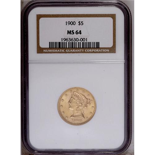 <B>1900 $5 MS64 NGC.</B></I> Softly struck around the obverse periphery but boldly struck in the centers, with superb definition on Liberty's hair and the eagle's neck, wings, and claws. Highly lustrous, with appealing lemon-gold color, and a minimum of mentionable abrasions.