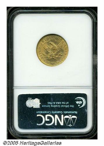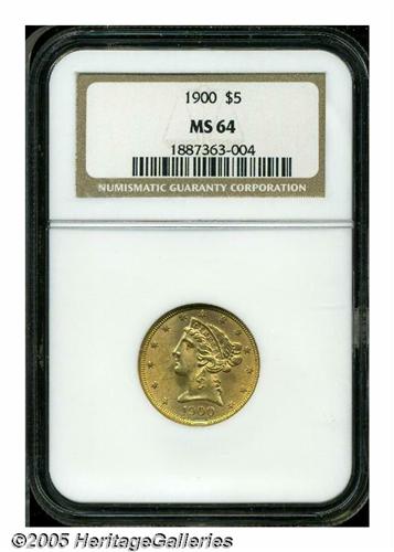<B>1900<$5> MS64 NGC.</B></I> Softly struck on the obverse stars, with gleaming red-gold surfaces that only suffer slightly from minute luster grazing on each side of the coin. Not far from Gem quality.