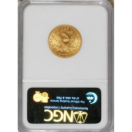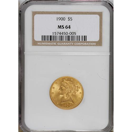 <B>1900 $5 MS64 NGC.</B></I> This smooth near-Gem is boldly struck and sharply struck. The few obverse marks are minor and inconspicuously located. A charming gold type coin from the turn of the prior century.<BR><BR><b>Shipping:</b> Coins & Currency (<a target="_blank" href="http://www.heritageauctions.com/common/shipping.php">view shipping information</a>)
