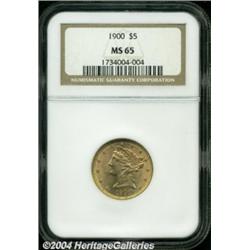 <table><tbody><tr><td><table> <TR><TD width="100%"><TABLE cellSpacing=1 cellPadding=3 width="100%" border=0><TBODY><TR><TD width="100%" bgColor=#79735c><FONT face=arial color=#ffffff size=3><B>Description</B> </FONT></TD></TR><TR><TD width="100%" bgColor=#ffffff><FONT face=arial size=2><B>1900 $5 MS65 NGC.</B></I> A common date, the 1900 is a perfect type candidate. Gems are, nonetheless, scarce, but they are still an excellent choice to represent the Motto type. The luster on both sides is expectantly vibrant for the grade. The surfaces are aglow with mint frost and original yellow-gold color. Well struck, save for several of the stars, a couple of dark alloy spots are seen in the region of the arrowheads on the reverse. </FONT></TD></TR></TBODY></TABLE></TD></TR></TBODY></TABLE><BR><A name=PricesRealized></A><TABLE cellSpacing=0 cellPadding=0 width="100%" bgColor=#000000 border=0><TBODY><TR><TD width="100%"><TABLE cellSpacing=1 cellPadding=3 width="100%" border=0><TBODY><TR><TD width="100%" bgColor=#79735c><A name=PR><FONT face=arial color=#ffffff size=3><B>Previous Prices from Heritage Auctions</B> </FONT></A></TD></TR><TR><TD bgColor=#f6f6ed><TABLE cellSpacing=0 cellPadding=0 width="100%" border=1><TBODY><TR><TD align=middle width="33%"><B>Date</B></TD><TD align=middle width="33%"><B>Service</B></TD><TD align=middle width="33%"><B>Price</B></TD></TR><TR bgColor=whitesmoke><TD width="33%"><B>01/02/2001</B></TD><TD width="33%">NGC</TD><TD width="33%">$2,500.00</TD></TR><TR bgColor=whitesmoke><TD width="33%"><B>08/07/2000</B></TD><TD width="33%">NGC</TD><TD width="33%">$3,105.00</TD></TR><TR bgColor=whitesmoke><TD width="33%"><B>08/16/1995</B></TD><TD width="33%">NGC</TD><TD width="33%">$3,685.00</TD></TR><TR bgColor=whitesmoke><TD width="33%"><B>09/01/1994</B></TD><TD width="33%">NGC</TD><TD width="33%">$3,080.00</TD></TR></TBODY></TABLE></TD></TR><TR><TD bgColor=#ffffff><FONT face=arial size=1 ?>PLEASE NOTE: All prices realized reflect the final hammer price PLUS the buyer's premium in auctions that charge a buyer's premium. Each item has a notation at the top of the listing indicating whether that lot included a buyer's premium. Example: A item that sells with a final hammer price of $100 and a 20% buyer's premium will display with a price realized of $120. All information listed is intended to be as accurate as possible, but errors are possible. Please use this guide carefully and inform us of any inaccuracies. </FONT></TD></TR></TBODY></TABLE></TD></TR></TBODY></TABLE><BR><TABLE cellSpacing=0 cellPadding=0 width="100%" bgColor=#000000 border=0><TBODY><TR><TD width="100%"><TABLE cellSpacing=1 cellPadding=3 width="100%" border=0><TBODY><TR><TD width="100%" bgColor=#79735c colSpan=6><FONT face=arial color=#ffffff size=3><B>Price Guide*</B> </FONT></TD></TR><TR bgColor=#f6f6ed><TD align=middle><B>Grade</B> </TD><TD align=middle><B>Coin World<BR>(Trends)</B> </TD><TD align=middle><B>Numismedia<BR>Retail</B> </TD><TD align=middle><B>Numismedia<BR>Wholesale</B> </TD><TD align=middle><B>Coin<BR>Universe</B> </TD><TD align=middle><B>Heritage<BR>Value Index</B> </TD></TR><TR bgColor=#ffffff><TD align=middle>64</TD><TD align=right>$1,250.00</TD><TD align=right>---</TD><TD align=right>$925.00</TD><TD align=right>$1,425.00</TD><TD align=right>$987.75</TD></TR><TR style="FONT-WEIGHT: bold" bgColor=#cccfdd><TD align=middle>65</TD><TD align=right>---</TD><TD align=right>---</TD><TD align=right>$2,350.00</TD><TD align=right>$3,250.00</TD><TD align=right>$2,406.33</TD></TR><TR bgColor=#ffffff><TD align=middle>66</TD><TD align=right>---</TD><TD align=right>---</TD><TD align=right>$5,750.00</TD><TD align=right>$12,200.00</TD><TD align=right>$6,275.67</TD></TR><TR bgColor=#ffffff><TD colSpan=6><FONT size=1>*All information listed is intended to be as accurate as possible, but errors are possible. No item may be returned or refused based on this information which is provided as a service to our customers. You should contact each pricing source directly to determine the accuracy of this information. </FONT></TD></TR></TBODY></TABLE></TD></TR></TBODY></TABLE><BR><TABLE cellSpacing=0 cellPadding=0 width="100%" bgColor=#000000 border=0><TBODY><TR><TD width="100%"><TABLE cellSpacing=1 cellPadding=3 width="100%" border=0><TBODY><TR><TD width="100%" bgColor=#79735c><FONT face=arial color=#ffffff size=3><B>Population Guide</B> </FONT></TD></TR><TR bgColor=#ffffff><TD align=middle><!-- Begin Output of Population Grid--><TABLE cellSpacing=0 cellPadding=0 width="100%" border=0><TBODY><TR><TD vAlign=center><TABLE cellSpacing=0 width="100%" border=1 cellsadding="3"><TBODY><TR><TD vAlign=center><TABLE cellSpacing=0 cellPadding=3 width="100%" border=1><TBODY><TR><TD vAlign=center align=middle bgColor=#f0f1e8 colSpan=2 <CENTER><FONT face=Arial size=2><B>PCGS Pop </B></FONT><CENTER></CENTER></TD><TD vAlign=center align=middle bgColor=#f0f1e8 colSpan=2><CENTER><FONT face=Arial size=2><B>NGC Pop</B></CENTER></FONT></TD></TR><TR><TD vAlign=center><FONT face=Arial size=2>(65)</FONT> </TD><TD vAlign=center align=right><FONT face=Arial size=2>34</FONT> </TD><TD vAlign=center><FONT face=Arial size=2>(65)</FONT> </TD><TD vAlign=center align=right><FONT face=Arial size=2>127</FONT> </TD></TR><TR><TD vAlign=center><FONT face=Arial size=2>(>65)</FONT> </TD><TD vAlign=center align=right><FONT face=Arial size=2>6</FONT> </TD><TD vAlign=center><FONT face=Arial size=2>(>65)</FONT> </TD><TD vAlign=center align=right><FONT face=Arial size=2>15</FONT> </TD></TR></TBODY></TABLE></TD></TR></TBODY></TABLE></TD></TR></TBODY></TABLE><!-- End Output of Population Grid--></TD></TR></TBODY></TABLE></TD></TR></TBODY></TABLE><BR><TABLE cellSpacing=0 cellPadding=0 width="100%" bgColor=#000000 border=0><TBODY><TR> <font color='#000000'><span style='background-color: #FFFFFF'><td bgcolor='#FFFFFE'> Important notice: Heritage usually auctions material at the rate of 200-250 lots per hour. On some occasions eBay Live bid software or the Internet may no