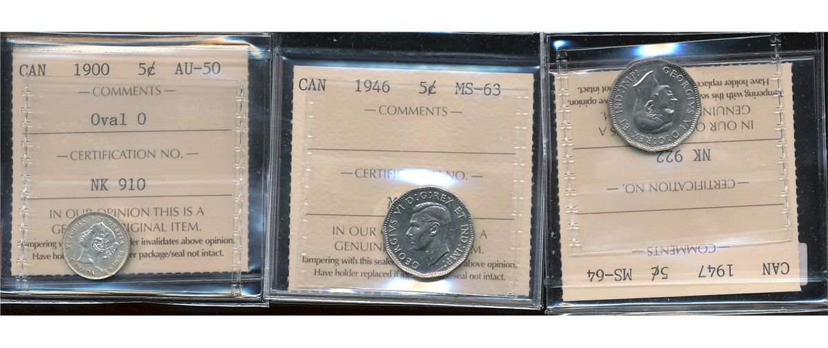 1900 5¢ Ov 0 AU50, 1946 MS63 & 1947 MS64. Lot of 3 ICCS graded coins.