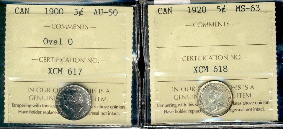 1900 5¢ Oval 0 AU50 & 1920 MS63. Lot of 2 coins both ICCS graded.