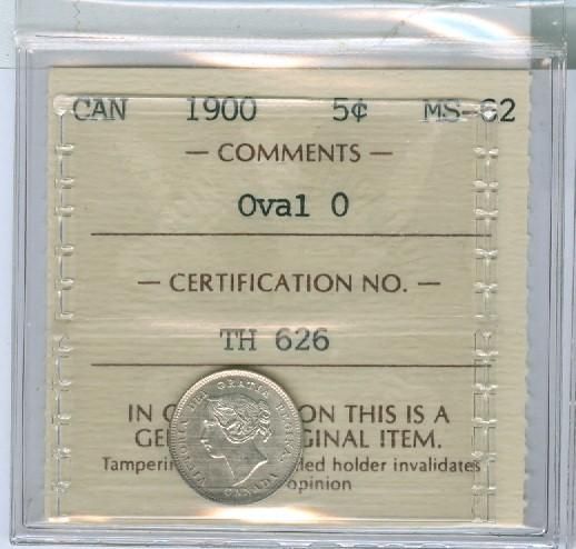 1900 5¢ Oval 0 ICCS MS62. White and lustrous.