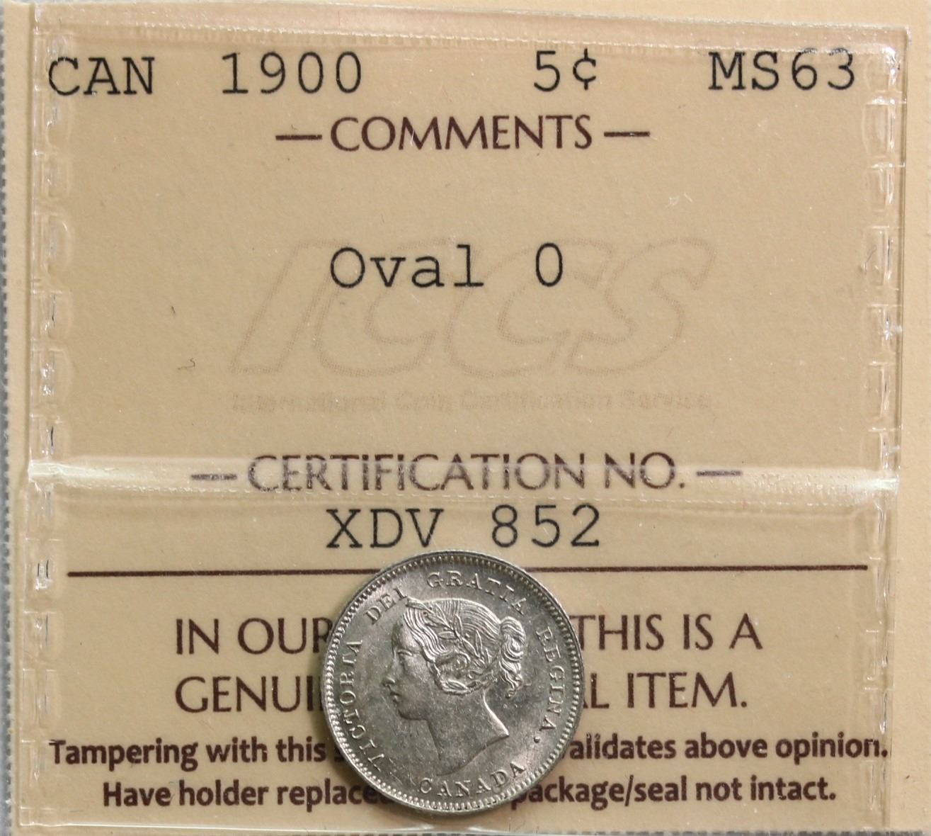 1900 5¢ "Oval O" ICCS Choice Mint State-63 Brilliant and lustrous.