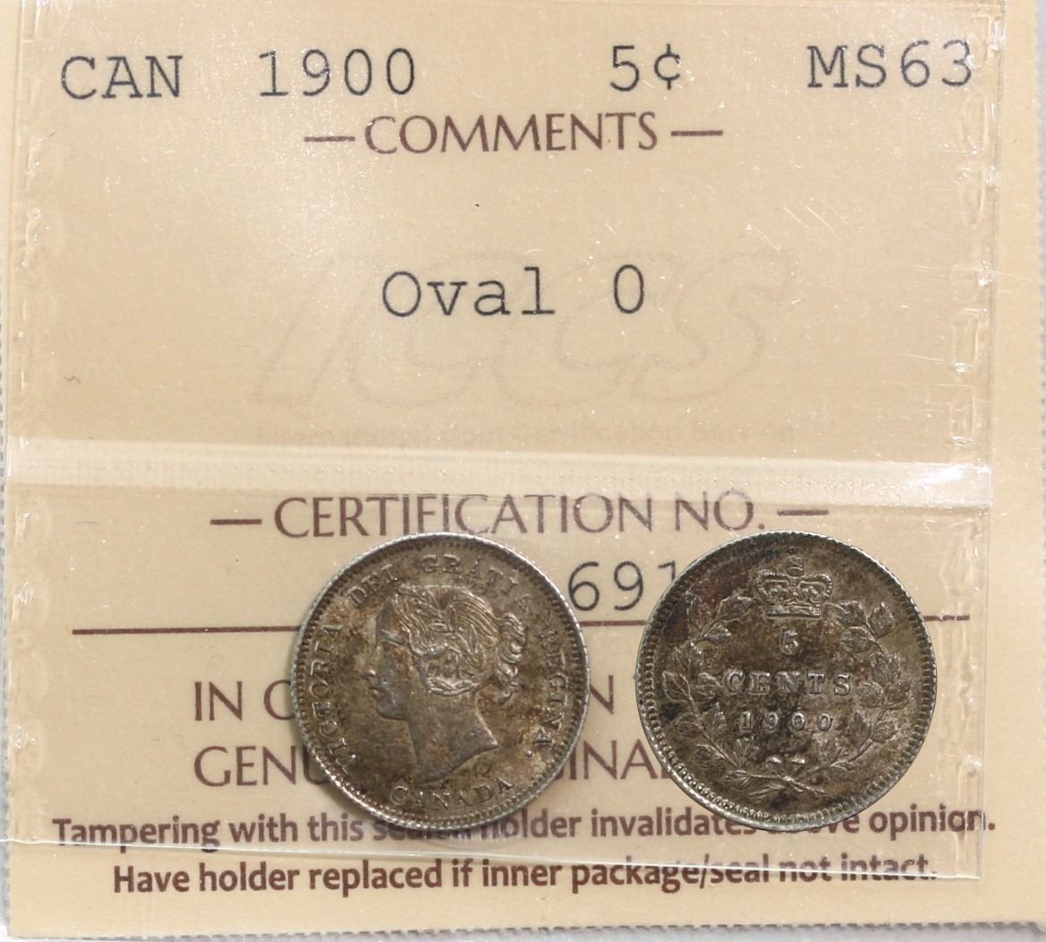 1900 5¢ "Oval O" ICCS Choice Mint State-63 Nice green and golden tones over full underlying lustre.