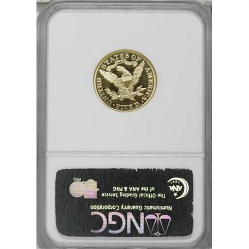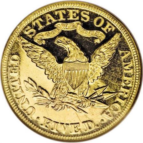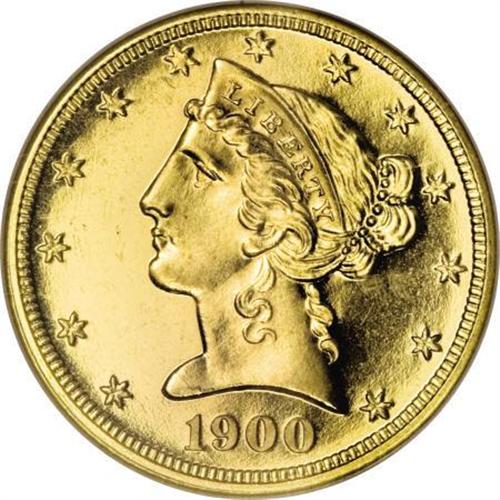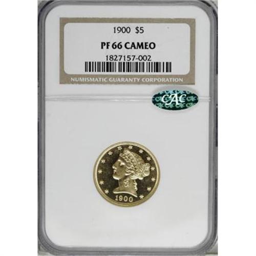 <B>1900 $5 PR66 Cameo NGC. CAC.</B></I> Rarely seen in such splendid condition combined with cameo contrast. Only 230 proofs were struck of this popular turn-of-the-century date. Of that number, probably no more than 100-110 examples are known today as recognizable proofs. Of those survivors approximately a third are non-Cameos, a third Cameo coins, and a third Deep Cameos. The reason for the higher percentage of contrasted proofs is 1900 was the last year before the Mint began to make a conscious effort to strike all-brilliant proofs. As such, even though this coin is the first from the new 20th century, it still retains the manufacturing method for making proofs from the 19th century. Another holdover from the latter part of the 19th century is the orange-peel texture in the fields, a trait that is rarely found on post-1900 proofs. <BR> The surfaces are noticeably contrasted, as stated, and the color is rich yellow-gold. Close examination reveals no mentionable contact marks on this splendid piece of proof gold. Census: 5 in 66 Cameo, 4 finer (1/08).<BR><I>From The Southwest Collection.</B></I><BR><BR><b>Shipping:</b> Coins & Currency (<a target="_blank" href="http://www.heritageauctions.com/common/shipping.php">view shipping information</a>)