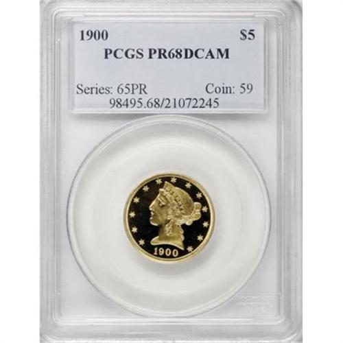<B>1900 $5 PR68 Deep Cameo PCGS.</B></I> The proof half eagle issue of 1900 presents a numismatic paradox. Often, numismatists and dealers will point to it as an ideal issue for the interested type collector. Still, it proves elusive, and while it has an abnormally high (by proof gold standards) mintage of 230 specimens, the heightened mintage has had little impact on present-day availability. Garrett and Guth (2006) note: "The date is not much more common than most of the issues of this time period. Many 1900 half eagles must have been destroyed as unsold." Such a fate likely befell the other proof gold issues for the year, which were struck in similarly heightened qualities, though not to the same extent as the five dollar gold coins.<BR> As a 19th century issue, the 1900 five dollar gold proofs are known to come with significant contrast, though such coins comprise fewer than one-quarter of the specimens in the PCGS <I>Population Report</B></I>. Four examples have been awarded a Cameo designation by PCGS and nine were granted Deep Cameo status. When the two classes are considered together and the two major certified populations combined, the 1900 is the most available proof half eagle issue with significant contrast. As with all other classic-era American proof gold, however, obtaining any example, much less one with substantial eye appeal, poses a significant challenge.<BR> Further analysis of the certification data compiled by PCGS produces some surprising revelations. In the <I>Population Report</B></I>, this is the lone PR68 exemplar with any contrast modifier for the year. Examining the series overview also shows that across the entire Liberty half eagle proof series, <I>this is the only PR68 piece ever graded by PCGS </B></I>(11/07), and the coin's Deep Cameo status only heightens its desirability. While three examples in PR68 appear in the NGC <I>Census Report</B></I>, two with the Cameo designation and one noted as Ultra Cameo, it is impossible to overestimate the importance of this PCGS-graded specimen to proof gold collectors, and Registry enthusiasts in particular. Its singular status would make it a crown jewel of even the finest cabinet.<BR> Representatives with the highest degree of contrast appear only rarely in the numismatic marketplace; Heritage has only offered one such piece at auction before, a PR64 Ultra Cameo exemplar in the November 2007 Houston sale. The infrequent nature of such appearances makes this breathtaking specimen all the more important. As one might surmise from the grade, the surfaces are virtually perfect, with magnification necessary to identify any post-striking flaws. Both sides offer exquisite black-and-gold contrast between the richly frosted, decisively struck devices and the glassy, immensely reflective fields. While the yellow-gold surfaces show few points that could serve as identifying markers, two tiny planchet flaws near the periphery, one to the right of the D in UNITED and the other above the second S in STATES, could serve as such. Neither has any impact on this specimen's incredible visual appeal, and the interested collector should view this coin in person. Its stellar beauty transcends even the best photography and description, and only up-close examination does the piece justice.<BR> Few coins offer the combination of beauty, condition rarity, and history that distinguishes this amazing representative. Whether one is assembling a comprehensive set of proof Liberty half eagles or pursuing the ultimate example for a type collection, the sale of this outstanding specimen creates a magnificent opportunity that may not be repeated for years. The discerning collector should bid accordingly.<BR><BR><b>Shipping:</b> Coins & Currency (<a target="_blank" href="http://www.heritageauctions.com/common/shipping.php">view shipping information</a>)