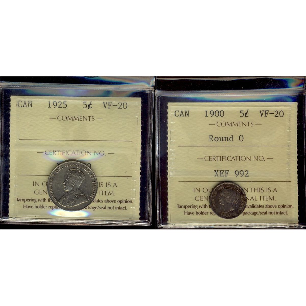 1900 5¢ Rd 0 & 1925 ICCS VF20. Lot of 2 coins.