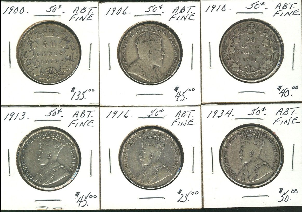 1900 50¢, 1906, 1910, 1913, 1916 & 1934. Lot of 6 coins all Abt Fine. (PBA).