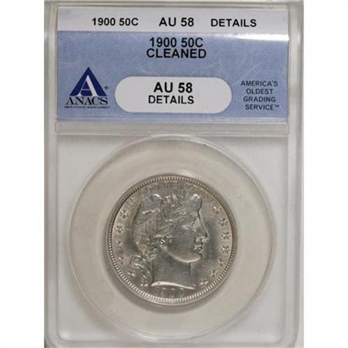 <B>1900 50C --Cleaned--ANACS. AU58 Details.</B></I> . NGC Census: (25/165). PCGS Population (20/172). Mintage: 4,762,912. Numismedia Wsl. Price for NGC/PCGS coin in AU58: $275. (#6486)<BR><BR><B>Coin Engraver:</B> Charles E. Barber<BR><BR><b>Shipping:</b> Coins & Currency (<a target="_blank" href="http://www.heritageauctions.com/common/shipping.php">view shipping information</a>)