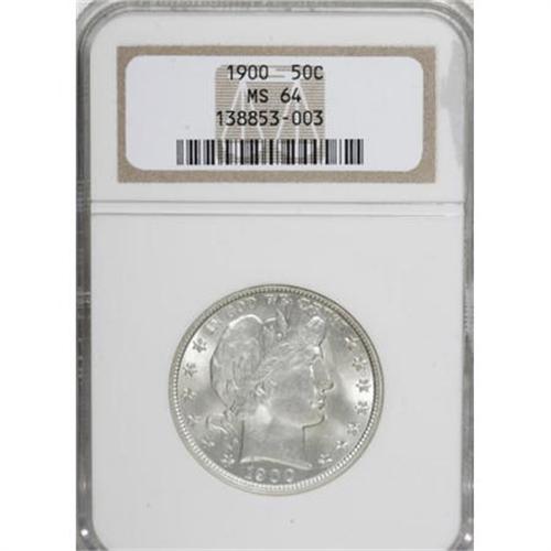 <B>1900 50C MS64 NGC.</B></I> Brilliant and frosty silver surfaces exhibit faint traces of champagne toning on close inspection. The details are boldly evident on both sides. Census: 47 in 64, 19 finer (1/08).<BR><I>From The Southwest Collection.</B></I><BR><BR><B>Coin Engraver:</B> Charles E. Barber<BR><BR><b>Shipping:</b> Coins & Currency (<a target="_blank" href="http://www.heritageauctions.com/common/shipping.php">view shipping information</a>)