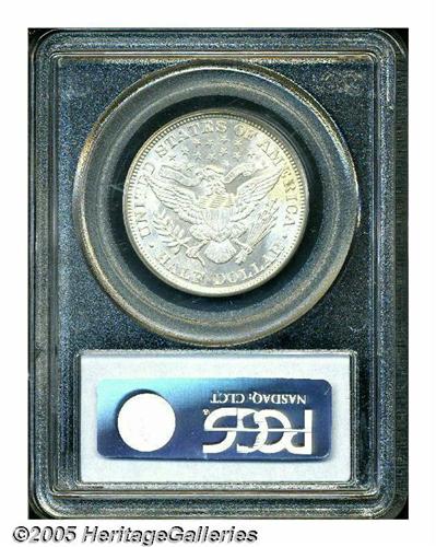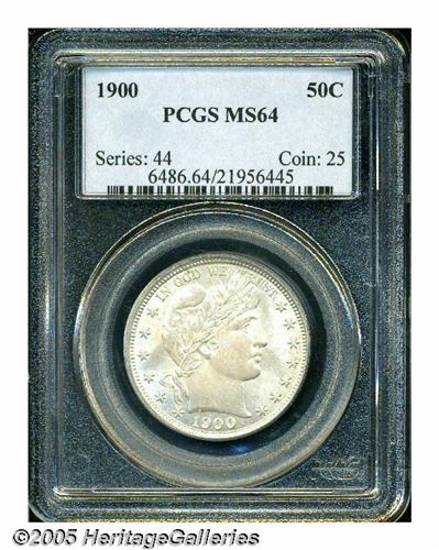 <B>1900<50C> MS64 PCGS.</B></I> Highly lustrous surfaces are visited by splotches of gold-tan patina, especially on the obverse, and a blush of same in the right (facing) reverse field. The design features all display nice definition, and a few minor marks on Liberty's cheek define the grade. Population: 33 in 64, 16 finer (4/05).