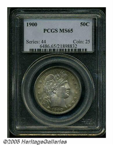 <B>1900<50C> MS65 PCGS.</B></I> As with many of the P-mint halves in the Barber series, the 1900 does not impress one immediately as a particularly rare coin. More than 4.7 million pieces were struck, but Gems are surprisingly difficult to locate. Each of the major services has certified 13 Gems with only three pieces in higher grades (5/05). This is a sharply defined coin that has soft, frosted mint luster that is accented by moderate golden-brown toning around the margins.