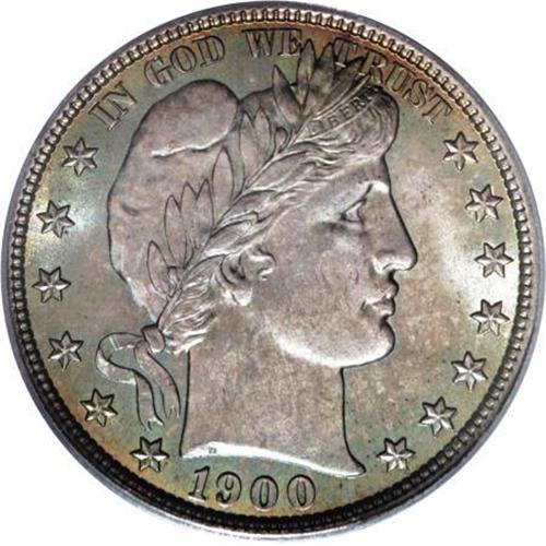 <B>1900 50C MS65 PCGS.</B></I> Exquisite apple-green and ocean-blue patina dominates, although glimmers of peach toning emerge along the borders. This intricately struck and exceptionally preserved Gem has outstanding eye appeal, and is certain to inspire a flurry of bid activity. Population: 17 in 65, 6 finer (6/07).<BR><BR><B>Coin Engraver:</B> Charles E. Barber<BR><BR><b>Shipping:</b> Coins & Currency (<a target="_blank" href="http://www.heritageauctions.com/common/shipping.php">view shipping information</a>\)