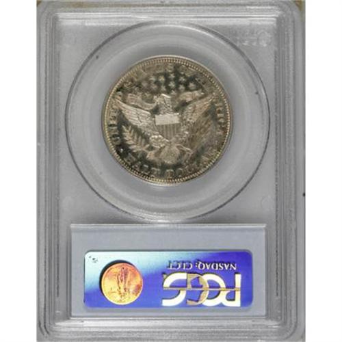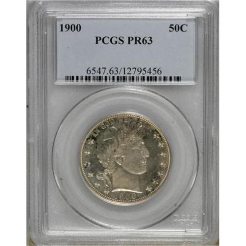 <B>1900 50C PR63 PCGS.</B></I> Soft silver-gray and gold-orange shadings prevail on this Select specimen, though the obverse margins show additional splashes of blood-red. Light, scattered hairlines in the fields preclude a finer designation.<BR><BR><B>Coin Engraver:</B> Charles E. Barber<BR><BR><b>Shipping:</b> Coins & Currency (<a target="_blank" href="http://www.heritageauctions.com/common/shipping.php">view shipping information</a>)