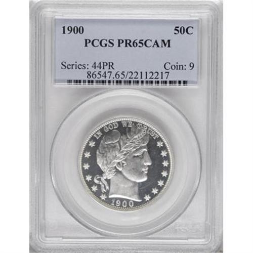 <B>1900 50C PR65 Cameo PCGS. CAC.</B></I> Beautiful Cameo surfaces are seen on both sides of this Gem Barber half, each being completely free of toning. An attentive strike emboldens the design elements, further enhancing the coin's overall eye appeal. The occasional faint and totally inoffensive hairline is interspersed with die polish lines on the obverse, and a curly as-made lint mark occurs on Liberty's cheek. Population: 9 in 65 Cameo, 12 finer (11/07).<BR><I>From The Kallenberg #1 PCGS Registry Set Of Proof Half Dollars.</B></I><BR><BR><b>Shipping:</b> Coins & Currency (<a target="_blank" href="http://www.heritageauctions.com/common/shipping.php">view shipping information</a>)
