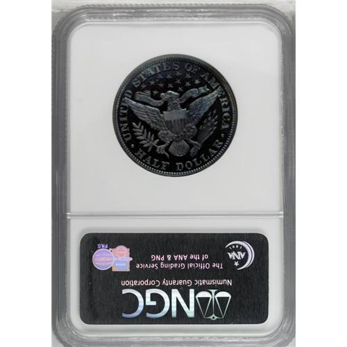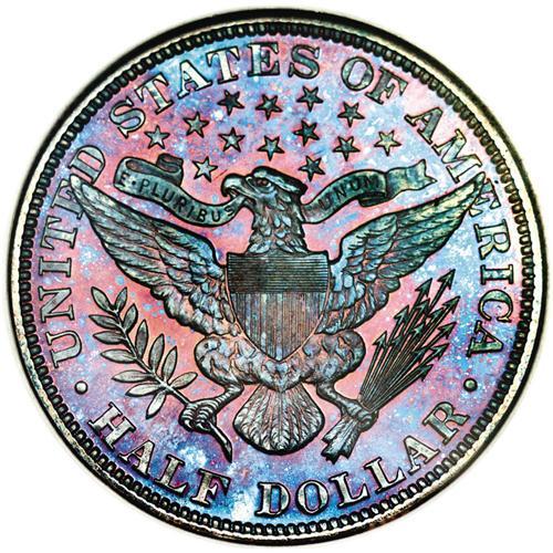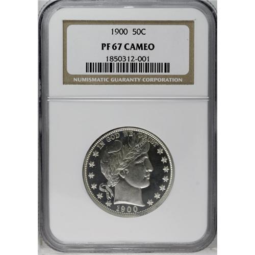 <B>1900<50C> PR67 Cameo NGC.</B></I> An interestingly toned example; the obverse is completely brilliant, the reverse is deeply toned in magnificent shades of cobalt-blue and crimson-magenta that is displayed in a variegated fashion. A profound cameo effect is seen overall and the surfaces are fully defined. For identification purposes, a tiny lateral mark is noted under Liberty's ear lobe, this only being visible with magnification. Census: 6 in 67 Cameo, 1 finer (5/06).