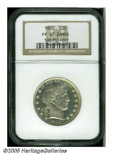<B>1900<50C> PR67 Cameo NGC.</B></I> This piece should be of great interest to type collectors as it has so many positive attributes: full, medal-like striking details, brilliant throughout, deeply mirrored fields, generous amounts of mint frost on the devices, pronounced contrast on each side, and the always-popular 1900 date for type purposes. Very scarce also with cameo contrast as well with only three other pieces certified as such by NGC with two finer (5/05).