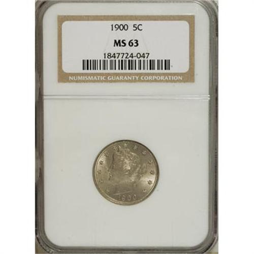 <B>1900 5C MS63 NGC.</B></I> NGC Census: (108/444). PCGS Population (170/436). Mintage: 27,255,996. Numismedia Wsl. Price for NGC/PCGS coin in MS63: $121. (#3861)<BR><BR><B>Coin Engraver:</B> Charles E. Barber<BR><BR><b>Shipping:</b> Coins & Currency (<a target="_blank" href="http://www.heritageauctions.com/common/shipping.php">view shipping information</a>)