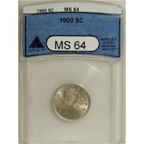 <B>1900 5C MS64 ANACS.</B></I> NGC Census: (259/184). PCGS Population (262/169). Mintage: 27,255,996. Numismedia Wsl. Price for NGC/PCGS coin in MS64: $200. (#3861)<BR><BR><B>Coin Engraver:</B> Charles E. Barber<BR><BR><b>Shipping:</b> Coins & Currency (<a target="_blank" href="http://www.heritageauctions.com/common/shipping.php">view shipping information</a>)
