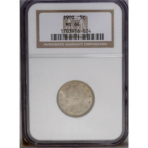 <B>1900 5C MS64 NGC.</B></I> Reflective steel-gray surfaces with a hint of copper-gold in the protected areas. Well struck and frosty, with a scrape above Liberty's head near star 9.