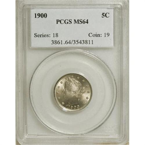 <B>1900 5C MS64 PCGS.</B></I> PCGS Population (283/174). NGC Census: (266/185). Mintage: 27,255,996. Numismedia Wsl. Price for NGC/PCGS coin in MS64: $200. (#3861)<BR><BR><B>Coin Engraver:</B> Charles E. Barber<BR><BR><b>Shipping:</b> Coins & Currency (<a target="_blank" href="http://www.heritageauctions.com/common/shipping.php">view shipping information</a>)