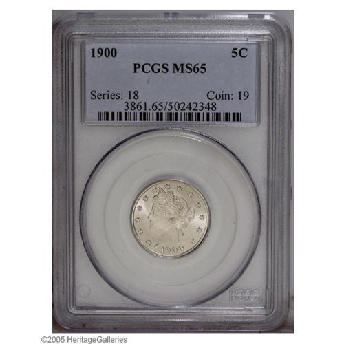 1900 5C MS65 PCGS. Well preserved surfaces display nic 1900[5C] MS65 PCGS.