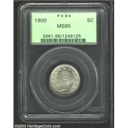 <TR><TD width="100%"><TABLE cellSpacing=1 cellPadding=3 width="100%" border=0><TBODY><TR><TD width="100%" bgColor=#79735c><FONT face=arial color=#ffffff size=3><B>Description</B> </FONT></TD></TR><TR><TD width="100%" bgColor=#ffffff><FONT face=arial size=2><B>1900 5C MS65 PCGS.</B></I> Satiny and lustrous, with just a bit of toning over light champagne surfaces. Boldly-struck, with virtually no marks. A little planchet flake is noted by the second star to the left of the date. </FONT></TD></TR></TBODY></TABLE></TD></TR></TBODY></TABLE><BR><A name=PricesRealized></A><TABLE cellSpacing=0 cellPadding=0 width="100%" bgColor=#000000 border=0><TBODY><TR><TD width="100%"><TABLE cellSpacing=1 cellPadding=3 width="100%" border=0><TBODY><TR><TD width="100%" bgColor=#79735c><A name=PR><FONT face=arial color=#ffffff size=3><B>Previous Prices from Heritage Auctions</B> </FONT></A></TD></TR><TR><TD bgColor=#f6f6ed><TABLE cellSpacing=0 cellPadding=0 width="100%" border=1><TBODY><TR><TD align=middle width="33%"><B>Date</B></TD><TD align=middle width="33%"><B>Service</B></TD><TD align=middle width="33%"><B>Price</B></TD></TR><TR bgColor=whitesmoke><TD width="33%"><B>01/13/2003</B></TD><TD width="33%">NGC</TD><TD width="33%">$368.00</TD></TR><TR bgColor=whitesmoke><TD width="33%"><B>09/28/2002</B></TD><TD width="33%">NGC</TD><TD width="33%">$552.00</TD></TR><TR bgColor=whitesmoke><TD width="33%"><B>09/25/2001</B></TD><TD width="33%">NGC</TD><TD width="33%">$410.00</TD></TR><TR bgColor=whitesmoke><TD width="33%"><B>04/30/1993</B></TD><TD width="33%">NGC</TD><TD width="33%">$385.00</TD></TR><TR bgColor=whitesmoke><TD width="33%"><B>06/04/1995</B></TD><TD width="33%">NGC</TD><TD width="33%">$275.00</TD></TR><TR bgColor=whitesmoke><TD width="33%"><B>01/30/2001</B></TD><TD width="33%">NGC</TD><TD width="33%">$390.00</TD></TR><TR bgColor=whitesmoke><TD width="33%"><B>03/04/1994</B></TD><TD width="33%">NGC</TD><TD width="33%">$357.50</TD></TR><TR bgColor=whitesmoke><TD width="33%"><B>12/03/1993</B></TD><TD width="33%">NGC</TD><TD width="33%">$385.00</TD></TR><TR bgColor=whitesmoke><TD width="33%"><B>04/14/2000</B></TD><TD width="33%">PCGS</TD><TD width="33%">$356.50</TD></TR><TR bgColor=whitesmoke><TD width="33%"><B>12/03/1993</B></TD><TD width="33%">PCGS</TD><TD width="33%">$385.00</TD></TR><TR bgColor=whitesmoke><TD width="33%"><B>05/06/2003</B></TD><TD width="33%">NGC</TD><TD width="33%">$391.00</TD></TR></TBODY></TABLE></TD></TR><TR><TD bgColor=#ffffff><FONT face=arial size=1 ?>PLEASE NOTE: All prices realized reflect the final hammer price PLUS the buyer's premium in auctions that charge a buyer's premium. Each item has a notation at the top of the listing indicating whether that lot included a buyer's premium. Example: A item that sells with a final hammer price of $100 and a 20% buyer's premium will display with a price realized of $120. All information listed is intended to be as accurate as possible, but errors are possible. Please use this guide carefully and inform us of any inaccuracies. </FONT></TD></TR></TBODY></TABLE></TD></TR></TBODY></TABLE><BR><TABLE cellSpacing=0 cellPadding=0 width="100%" bgColor=#000000 border=0><TBODY><TR><TD width="100%"><TABLE cellSpacing=1 cellPadding=3 width="100%" border=0><TBODY><TR><TD width="100%" bgColor=#79735c colSpan=6><FONT face=arial color=#ffffff size=3><B>Price Guide*</B> </FONT></TD></TR><TR bgColor=#f6f6ed><TD align=middle><B>Grade</B> </TD><TD align=middle><B>Coin World<BR>(Trends)</B> </TD><TD align=middle><B>Numismedia<BR>Retail</B> </TD><TD align=middle><B>Numismedia<BR>Wholesale</B> </TD><TD align=middle><B>Coin<BR>Universe</B> </TD><TD align=middle><B>Heritage<BR>Value Index</B> </TD></TR><TR bgColor=#ffffff><TD align=middle>64</TD><TD align=right>$180.00</TD><TD align=right>$238.00</TD><TD align=right>$190.00</TD><TD align=right>$185.00</TD><TD align=right>$131.25</TD></TR><TR style="FONT-WEIGHT: bold" bgColor=#cccfdd><TD align=middle>65</TD><TD align=right>$535.00</TD><TD align=right>$600.00</TD><TD align=right>$480.00</TD><TD align=right>$750.00</TD><TD align=right>$406.63</TD></TR><TR bgColor=#ffffff><TD align=middle>66</TD><TD align=right>$1,350.00</TD><TD align=right>---</TD><TD align=right>$850.00</TD><TD align=right>$1,950.00</TD><TD align=right>$1,153.33</TD></TR><TR bgColor=#ffffff><TD colSpan=6><FONT size=1>*All information listed is intended to be as accurate as possible, but errors are possible. No item may be returned or refused based on this information which is provided as a service to our customers. You should contact each pricing source directly to determine the accuracy of this information. </FONT></TD></TR></TBODY></TABLE></TD></TR></TBODY></TABLE><BR><TABLE cellSpacing=0 cellPadding=0 width="100%" bgColor=#000000 border=0><TBODY><TR><TD width="100%"><TABLE cellSpacing=1 cellPadding=3 width="100%" border=0><TBODY><TR><TD width="100%" bgColor=#79735c><FONT face=arial color=#ffffff size=3><B>Population Guide</B> </FONT></TD></TR><TR bgColor=#ffffff><TD align=middle><!-- Begin Output of Population Grid--><TABLE cellSpacing=0 cellPadding=0 width="100%" border=0><TBODY><TR><TD vAlign=center><TABLE cellSpacing=0 width="100%" border=1 cellsadding="3"><TBODY><TR><TD vAlign=center><TABLE cellSpacing=0 cellPadding=3 width="100%" border=1><TBODY><TR><TD vAlign=center align=middle bgColor=#f0f1e8 colSpan=2 <CENTER><FONT face=Arial size=2><B>PCGS Pop </B></FONT><CENTER></CENTER></TD><TD vAlign=center align=middle bgColor=#f0f1e8 colSpan=2><CENTER><FONT face=Arial size=2><B>NGC Pop</B></CENTER></FONT></TD></TR><TR><TD vAlign=center><FONT face=Arial size=2>(65)</FONT> </TD><TD vAlign=center align=right><FONT face=Arial size=2>86</FONT> </TD><TD vAlign=center><FONT face=Arial size=2>(65)</FONT> </TD><TD vAlign=center align=right><FONT face=Arial size=2>129</FONT> </TD></TR><TR><TD vAlign=center><FONT face=Arial size=2>(>65)</FONT> </TD><TD vAlign=center align=right><FONT face=Arial size=2>22</FONT> </TD><TD vAlign=center><FONT face=Arial size=2>(