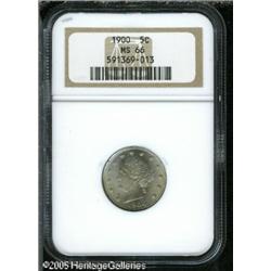 <B>1900 5C MS66 NGC.</B></I> Exceptionally smooth and lustrous. A moderate coating of ice-blue patina has gathered on each side. A remarkable Gem for the Liberty nickel collector. Population: 32 in 66, 1 finer (1/05). Lot:5887