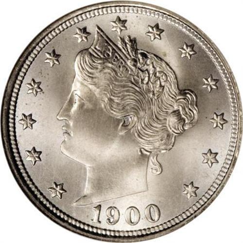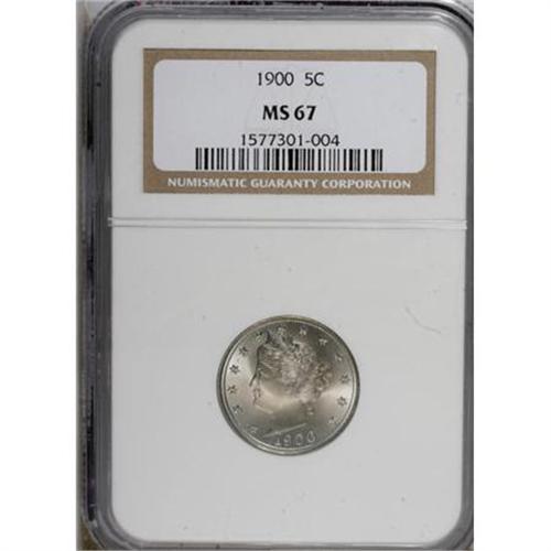 <B>1900 5C MS67 NGC.</B></I> Glowing luster exudes from both sides of this Superb Gem, each of which displays a thin coat of barely discernible powder-blue color, joined by a splash of golden-brown on the lower right reverse quadrant. Generally well struck, save for the usual weakness in the wreath immediately left of the bowknot. A few light flecks are scattered about, especially on the obverse. Census: 3 in 67, 0 finer (9/07).<BR><BR><B>Coin Engraver:</B> Charles E. Barber<BR><BR><b>Shipping:</b> Coins & Currency (<a target="_blank" href="http://www.heritageauctions.com/common/shipping.php">view shipping information</a>)