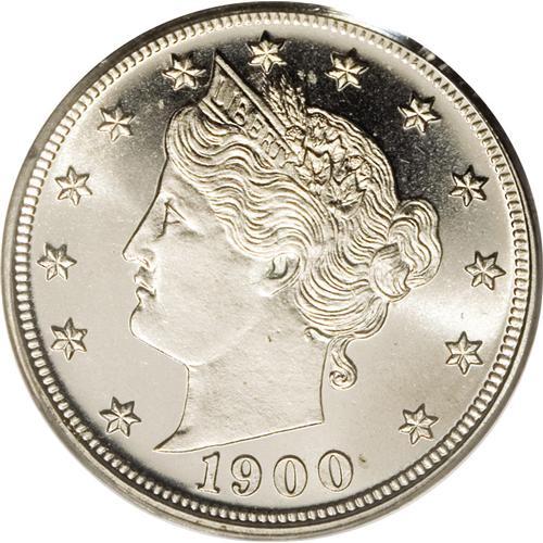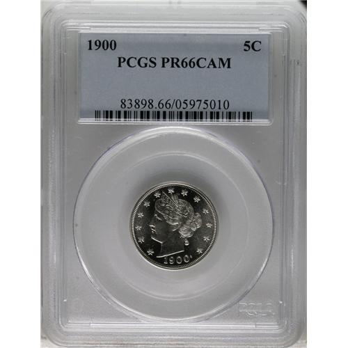 <B>1900 5C PR66 Cameo PCGS.</B></I> This Premium Gem Liberty nickel is bright and flashy, with dazzling mirrored fields and beautifully frosted devices. A tiny contact mark is noted near the corner of Liberty's mouth, but the overall quality of the coin is such that this minor flaw is easy to forgive. Population: 12 in 66 Cameo, 9 finer (2/07).<BR><BR><b>Shipping:</b> Coins & Currency (<a target="_blank" href="http://www.heritageauctions.com/common/shipping.php">view shipping information</a>)