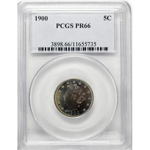 <B>1900 5C PR66 PCGS.</B></I> Gorgeous peach, honey, powder-blue, and salmon-pink endow this exquisitely struck Premium Gem. A high grade example of this turn-of-the-century proof type. Population: 62 in 66, 14 finer (11/07).<BR><I>From The Madison Collection.</B></I><BR><BR><B>Coin Engraver:</B> Charles E. Barber<BR><BR><b>Shipping:</b> Coins & Currency (<a target="_blank" href="http://www.heritageauctions.com/common/shipping.php">view shipping information</a>)