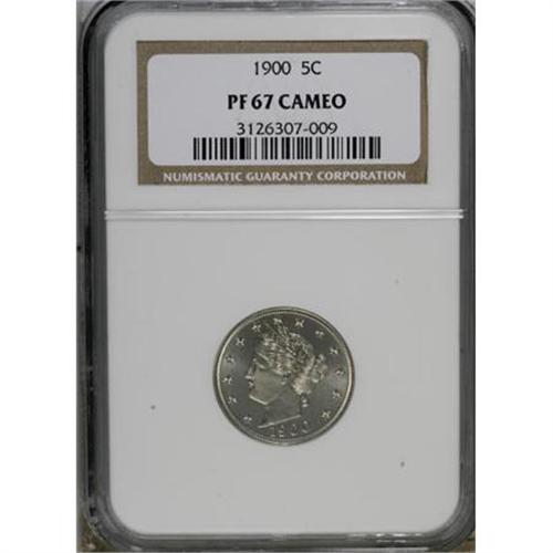 <B>1900 5C PR67 Cameo NGC.</B></I> Boldly struck and gleaming with impressive contrast, a rarity for this desirable turn-of-the-century proof nickel issue. The obverse is essentially untoned, though the right reverse displays faint hints of rose. Census: 5 in 67 Cameo, 0 finer (1/08).<BR><BR><b>Shipping:</b> Coins & Currency (<a target="_blank" href="http://www.heritageauctions.com/common/shipping.php">view shipping information</a>)