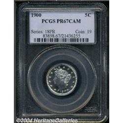 <table><tbody><tr><td><table> <TR><TD width="100%"><TABLE cellSpacing=1 cellPadding=3 width="100%" border=0><TBODY><TR><TD width="100%" bgColor=#79735c><FONT face=arial color=#ffffff size=3><B>Description</B> </FONT></TD></TR><TR><TD width="100%" bgColor=#ffffff><FONT face=arial size=2><B>1900 5C PR67 Cameo PCGS.</B></I> A sparkling white-on-black example of this always-popular turn-of-the-century date. The surfaces are essentially flawless and there is significant mint frost on the devices. Population: 4 in 67, 0 finer (10/03). </FONT></TD></TR></TBODY></TABLE></TD></TR></TBODY></TABLE><BR><A name=PricesRealized></A><TABLE cellSpacing=0 cellPadding=0 width="100%" bgColor=#000000 border=0><TBODY><TR><TD width="100%"><TABLE cellSpacing=1 cellPadding=3 width="100%" border=0><TBODY><TR><TD width="100%" bgColor=#79735c><A name=PR><FONT face=arial color=#ffffff size=3><B>Previous Prices from Heritage Auctions</B> </FONT></A></TD></TR><TR><TD bgColor=#f6f6ed><TABLE cellSpacing=0 cellPadding=0 width="100%" border=1><TBODY><TR><TD align=middle width="33%"><B>Date</B></TD><TD align=middle width="33%"><B>Service</B></TD><TD align=middle width="33%"><B>Price</B></TD></TR><TR bgColor=whitesmoke><TD width="33%"><B>09/20/2003</B></TD><TD width="33%">PCGS</TD><TD width="33%">$4,887.50</TD></TR></TBODY></TABLE></TD></TR><TR><TD bgColor=#ffffff><FONT face=arial size=1 ?>PLEASE NOTE: All prices realized reflect the final hammer price PLUS the buyer's premium in auctions that charge a buyer's premium. Each item has a notation at the top of the listing indicating whether that lot included a buyer's premium. Example: A item that sells with a final hammer price of $100 and a 20% buyer's premium will display with a price realized of $120. All information listed is intended to be as accurate as possible, but errors are possible. Please use this guide carefully and inform us of any inaccuracies. </FONT></TD></TR></TBODY></TABLE></TD></TR></TBODY></TABLE><BR><TABLE cellSpacing=0 cellPadding=0 width="100%" bgColor=#000000 border=0><TBODY><TR><TD width="100%"><TABLE cellSpacing=1 cellPadding=3 width="100%" border=0><TBODY><TR><TD width="100%" bgColor=#79735c colSpan=6><FONT face=arial color=#ffffff size=3><B>Price Guide*</B> </FONT></TD></TR><TR bgColor=#f6f6ed><TD align=middle><B>Grade</B> </TD><TD align=middle><B>Coin World<BR>(Trends)</B> </TD><TD align=middle><B>Numismedia<BR>Retail</B> </TD><TD align=middle><B>Numismedia<BR>Wholesale</B> </TD><TD align=middle><B>Coin<BR>Universe</B> </TD><TD align=middle><B>Heritage<BR>Value Index</B> </TD></TR><TR bgColor=#ffffff><TD align=middle>66</TD><TD align=right>---</TD><TD align=right>---</TD><TD align=right>---</TD><TD align=right>---</TD><TD align=right>---</TD></TR><TR style="FONT-WEIGHT: bold" bgColor=#cccfdd><TD align=middle>67</TD><TD align=right>---</TD><TD align=right>---</TD><TD align=right>---</TD><TD align=right>---</TD><TD align=right>---</TD></TR><TR bgColor=#ffffff><TD align=middle>68</TD><TD align=right>---</TD><TD align=right>---</TD><TD align=right>---</TD><TD align=right>---</TD><TD align=right>---</TD></TR><TR bgColor=#ffffff><TD colSpan=6><FONT size=1>*All information listed is intended to be as accurate as possible, but errors are possible. No item may be returned or refused based on this information which is provided as a service to our customers. You should contact each pricing source directly to determine the accuracy of this information. </FONT></TD></TR></TBODY></TABLE></TD></TR></TBODY></TABLE><BR><TABLE cellSpacing=0 cellPadding=0 width="100%" bgColor=#000000 border=0><TBODY><TR><TD width="100%"><TABLE cellSpacing=1 cellPadding=3 width="100%" border=0><TBODY><TR><TD width="100%" bgColor=#79735c><FONT face=arial color=#ffffff size=3><B>Population Guide</B> </FONT></TD></TR><TR bgColor=#ffffff><TD align=middle><!-- Begin Output of Population Grid--><TABLE cellSpacing=0 cellPadding=0 width="100%" border=0><TBODY><TR><TD vAlign=center><TABLE cellSpacing=0 width="100%" border=1 cellsadding="3"><TBODY><TR><TD vAlign=center><TABLE cellSpacing=0 cellPadding=3 width="100%" border=1><TBODY><TR><TD vAlign=center align=middle bgColor=#f0f1e8 colSpan=2 <CENTER><FONT face=Arial size=2><B>PCGS Pop </B></FONT><CENTER></CENTER></TD><TD vAlign=center align=middle bgColor=#f0f1e8 colSpan=2><CENTER><FONT face=Arial size=2><B>NGC Pop</B></CENTER></FONT></TD></TR><TR><TD vAlign=center><FONT face=Arial size=2>(67)</FONT> </TD><TD vAlign=center align=right><FONT face=Arial size=2>4</FONT> </TD><TD vAlign=center><FONT face=Arial size=2>(67)</FONT> </TD><TD vAlign=center align=right><FONT face=Arial size=2>6</FONT> </TD></TR><TR><TD vAlign=center><FONT face=Arial size=2>(>67)</FONT> </TD><TD vAlign=center align=right><FONT face=Arial size=2>0</FONT> </TD><TD vAlign=center><FONT face=Arial size=2>(>67)</FONT> </TD><TD vAlign=center align=right><FONT face=Arial size=2>0</FONT> </TD></TR></TBODY></TABLE></TD></TR></TBODY></TABLE></TD></TR></TBODY></TABLE><!-- End Output of Population Grid--></TD></TR></TBODY></TABLE></TD></TR></TBODY></TABLE><BR><TABLE cellSpacing=0 cellPadding=0 width="100%" bgColor=#000000 border=0><TBODY><TR> <font color='#000000'><span style='background-color: #FFFFFF'><td bgcolor='#FFFFFE'> Important notice: Heritage usually auctions material at the rate of 200-250 lots per hour. On some occasions eBay Live bid software or the Internet may not be able to keep up with the pace of the auction. We recommend placing a realistic absentee bid now as insurance to avoid disappointment. Occasionally the auctioneer may eliminate or reject an eBay Live bid, and the auctioneer may also reopen a lot after the close of the eBay live bidding (usually because we missed an audience bid), and may reject your bid even if it shows you as the winning bidder. By bidding via eBay Live, you agree that Heritage may award the lot to another bidder at its sole discretion under the circumstances described above or any other reasonable circumstances. Since eBay bids are not s