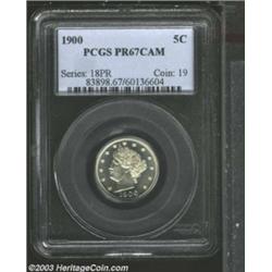 <TABLE cellSpacing=0 cellPadding=0 width="100%" bgColor=#000000 border=0><TBODY><TR><TD width="100%"><TABLE cellSpacing=1 cellPadding=3 width="100%" border=0><TBODY><TR><TD width="100%" bgColor=#79735c><FONT face=arial color=#ffffff size=3><B>Description</B> </FONT></TD></TR><TR><TD width="100%" bgColor=#ffffff><FONT face=arial size=2><B>1900 5C PR67 Cameo PCGS.</B></I> Shimmering mint brilliance characterizes this proof that also displays stark field-to-device contrast. The surfaces appear flawless to the unaided eye except for a tiny contact mark on the left stroke of the V on the reverse. A perfect type coin: the ultimate grade, cameo contrast, brilliant, and struck in this popular year for type collectors. Population: 1 in 67, 0 finer (8/03). </FONT></TD></TR></TBODY></TABLE></TD></TR></TBODY></TABLE><BR><A name=PricesRealized></A><TABLE cellSpacing=0 cellPadding=0 width="100%" bgColor=#000000 border=0><TBODY><TR><TD width="100%"><TABLE cellSpacing=1 cellPadding=3 width="100%" border=0><TBODY><TR><TD width="100%" bgColor=#79735c><A name=PR><FONT face=arial color=#ffffff size=3><B>Previous Prices from Heritage Auctions</B> </FONT></A></TD></TR><TR><TD bgColor=#f6f6ed>No Prior Data Recorded </TD></TR><TR><TD bgColor=#ffffff><FONT face=arial size=1 ?>PLEASE NOTE: All prices realized reflect the final hammer price PLUS the buyer's premium in auctions that charge a buyer's premium. Each item has a notation at the top of the listing indicating whether that lot included a buyer's premium. Example: A item that sells with a final hammer price of $100 and a 20% buyer's premium will display with a price realized of $120. All information listed is intended to be as accurate as possible, but errors are possible. Please use this guide carefully and inform us of any inaccuracies. </FONT></TD></TR></TBODY></TABLE></TD></TR></TBODY></TABLE><BR><TABLE cellSpacing=0 cellPadding=0 width="100%" bgColor=#000000 border=0><TBODY><TR><TD width="100%"><TABLE cellSpacing=1 cellPadding=3 width="100%" border=0><TBODY><TR><TD width="100%" bgColor=#79735c colSpan=6><FONT face=arial color=#ffffff size=3><B>Price Guide*</B> </FONT></TD></TR><TR bgColor=#f6f6ed><TD align=middle><B>Grade</B> </TD><TD align=middle><B>Coin World<BR>(Trends)</B> </TD><TD align=middle><B>Numismedia<BR>Retail</B> </TD><TD align=middle><B>Numismedia<BR>Wholesale</B> </TD><TD align=middle><B>Coin<BR>Universe</B> </TD><TD align=middle><B>Heritage<BR>Value Index</B> </TD></TR><TR bgColor=#ffffff><TD align=middle>66</TD><TD align=right>---</TD><TD align=right>---</TD><TD align=right>---</TD><TD align=right>---</TD><TD align=right>---</TD></TR><TR style="FONT-WEIGHT: bold" bgColor=#cccfdd><TD align=middle>67</TD><TD align=right>---</TD><TD align=right>---</TD><TD align=right>---</TD><TD align=right>---</TD><TD align=right>---</TD></TR><TR bgColor=#ffffff><TD align=middle>68</TD><TD align=right>---</TD><TD align=right>---</TD><TD align=right>---</TD><TD align=right>---</TD><TD align=right>---</TD></TR><TR bgColor=#ffffff><TD colSpan=6><FONT size=1>*All information listed is intended to be as accurate as possible, but errors are possible. No item may be returned or refused based on this information which is provided as a service to our customers. You should contact each pricing source directly to determine the accuracy of this information. </FONT></TD></TR></TBODY></TABLE></TD></TR></TBODY></TABLE><BR><TABLE cellSpacing=0 cellPadding=0 width="100%" bgColor=#000000 border=0><TBODY><TR><TD width="100%"><TABLE cellSpacing=1 cellPadding=3 width="100%" border=0><TBODY><TR><TD width="100%" bgColor=#79735c><FONT face=arial color=#ffffff size=3><B>Population Guide</B> </FONT></TD></TR><TR bgColor=#ffffff><TD align=middle><!-- Begin Output of Population Grid--><TABLE cellSpacing=0 cellPadding=0 width="100%" border=0><TBODY><TR><TD vAlign=center><TABLE cellSpacing=0 width="100%" border=1 cellsadding="3"><TBODY><TR><TD vAlign=center><TABLE cellSpacing=0 cellPadding=3 width="100%" border=1><TBODY><TR><TD vAlign=center align=middle bgColor=#f0f1e8 colSpan=2 <CENTER><FONT face=Arial size=2><B>PCGS Pop </B></FONT><CENTER></CENTER></TD><TD vAlign=center align=middle bgColor=#f0f1e8 colSpan=2><CENTER><FONT face=Arial size=2><B>NGC Pop</B></CENTER></FONT></TD></TR><TR><TD vAlign=center><FONT face=Arial size=2>(67)</FONT> </TD><TD vAlign=center align=right><FONT face=Arial size=2>1</FONT> </TD><TD vAlign=center><FONT face=Arial size=2>(67)</FONT> </TD><TD vAlign=center align=right><FONT face=Arial size=2>4</FONT> </TD></TR><TR><TD vAlign=center><FONT face=Arial size=2>(>67)</FONT> </TD><TD vAlign=center align=right><FONT face=Arial size=2>0</FONT> </TD><TD vAlign=center><FONT face=Arial size=2>(>67)</FONT> </TD><TD vAlign=center align=right><FONT face=Arial size=2>0</FONT> </TD></TR></TBODY></TABLE></TD></TR></TBODY></TABLE></TD></TR></TBODY></TABLE><!-- End Output of Population Grid--> Important notice: Heritage usually auctions material at the rate of 200-250 lots per hour. On some occasions eBay Live bid software or the Internet may not be able to keep up with the pace of the auction. We recommend placing a realistic absentee bid now as insurance to avoid disappointment. Occasionally the auctioneer may eliminate or reject an eBay Live bid, and the auctioneer may also reopen a lot after the close of the eBay live bidding (usually because we missed an audience bid), and may reject your bid even if it shows you as the winning bidder. By bidding via eBay Live, you agree that Heritage may award the lot to another bidder at its sole discretion under the circumstances described above or any other reasonable circumstances. Also please note that all Heritage lots purchased through eBay Live carry a 20% Buyer's Premium. Please make sure you read the Terms and Conditions before you bid.</TD></TR></TBODY></TABLE></TD></TR></TBODY></TABLE>